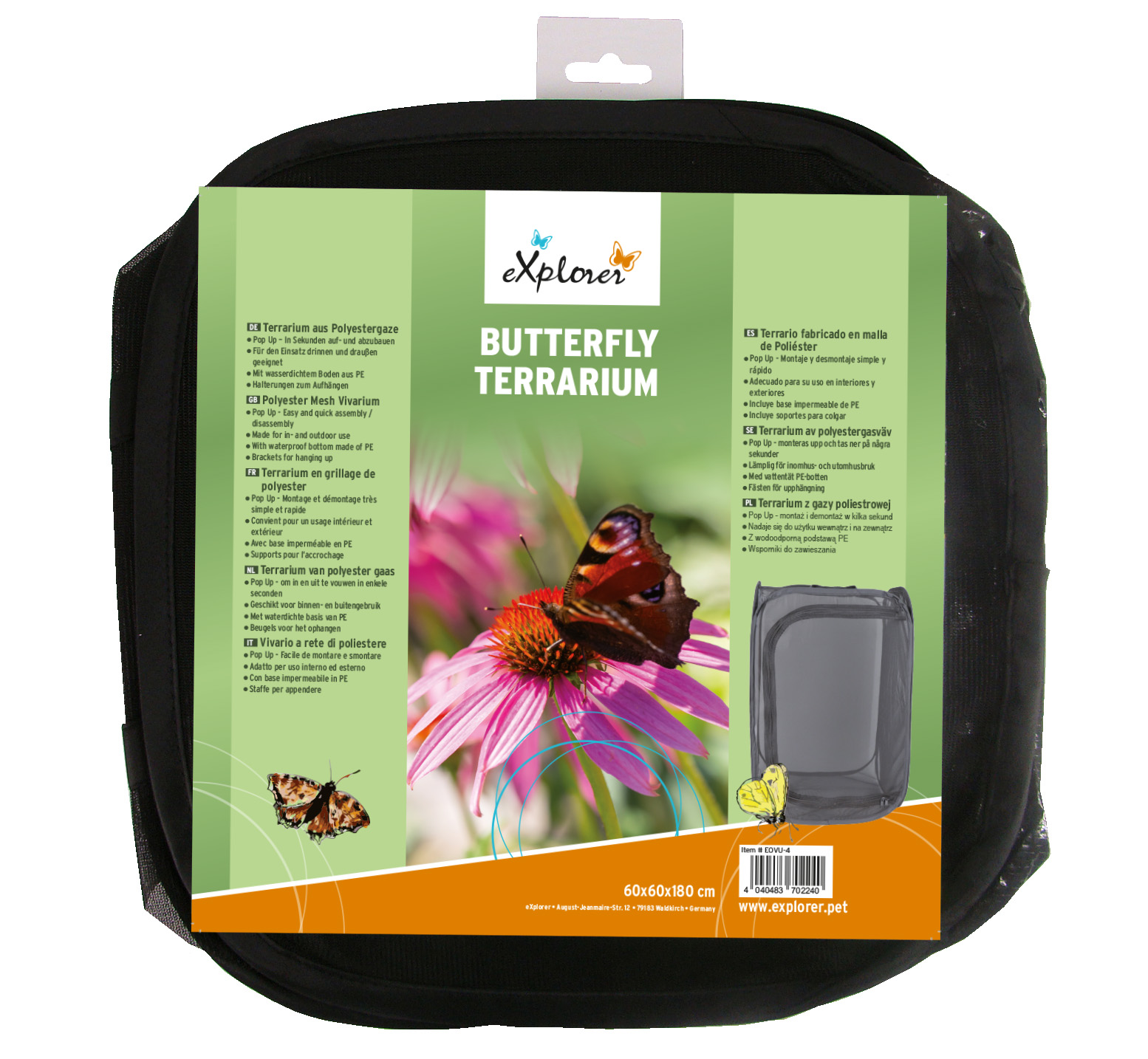 Das Butterfly Terrarium Pop Up von eXplorer ist die ideale Lösung für alle, die Schmetterlinge hautnah erleben möchten. Dieses vielseitige Vivarium bietet optimale Bedingungen für die Beobachtung und Pflege von Schmetterlingen und ist sowohl für den Einsatz drinnen als auch draußen geeignet.