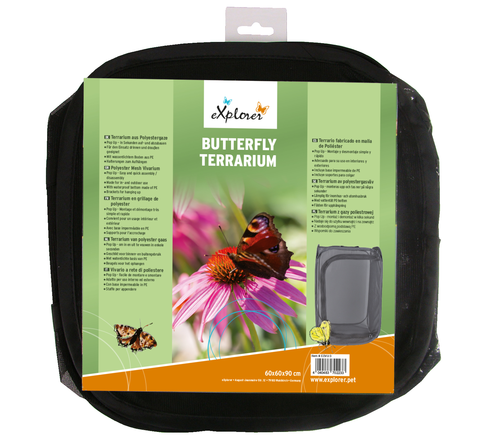 Das Butterfly Terrarium Pop Up von eXplorer ist die ideale Lösung für alle, die Schmetterlinge hautnah erleben möchten. Dieses vielseitige Vivarium bietet optimale Bedingungen für die Beobachtung und Pflege von Schmetterlingen und ist sowohl für den Einsatz drinnen als auch draußen geeignet.